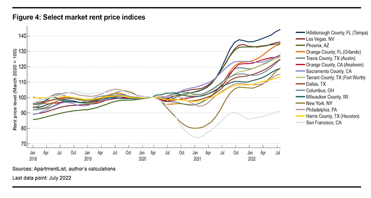 Figure 4 shows the price trends in 15 of the largest cities and counties included in this analysis, indexed to March of 2020. Data derive from Apartment List’s rent estimates at the city and county levels.6 Rent prices have varied more dramatically at the city level during the pandemic than they did in the years leading up to it. Large, dense, high-cost cities such as San Francisco and New York initially faced steep declines in rent prices during the start of the pandemic. Many other places saw slight declines or moderate increases in rents in the first year of the pandemic. In the first half of 2021, most places saw rent prices rise quickly and to varying degrees. As of June 2022, rent prices in Hillsborough County, Florida, have risen by more than 40 percent since the pandemic began, while rents in San Francisco have not yet returned to prepandemic levels.