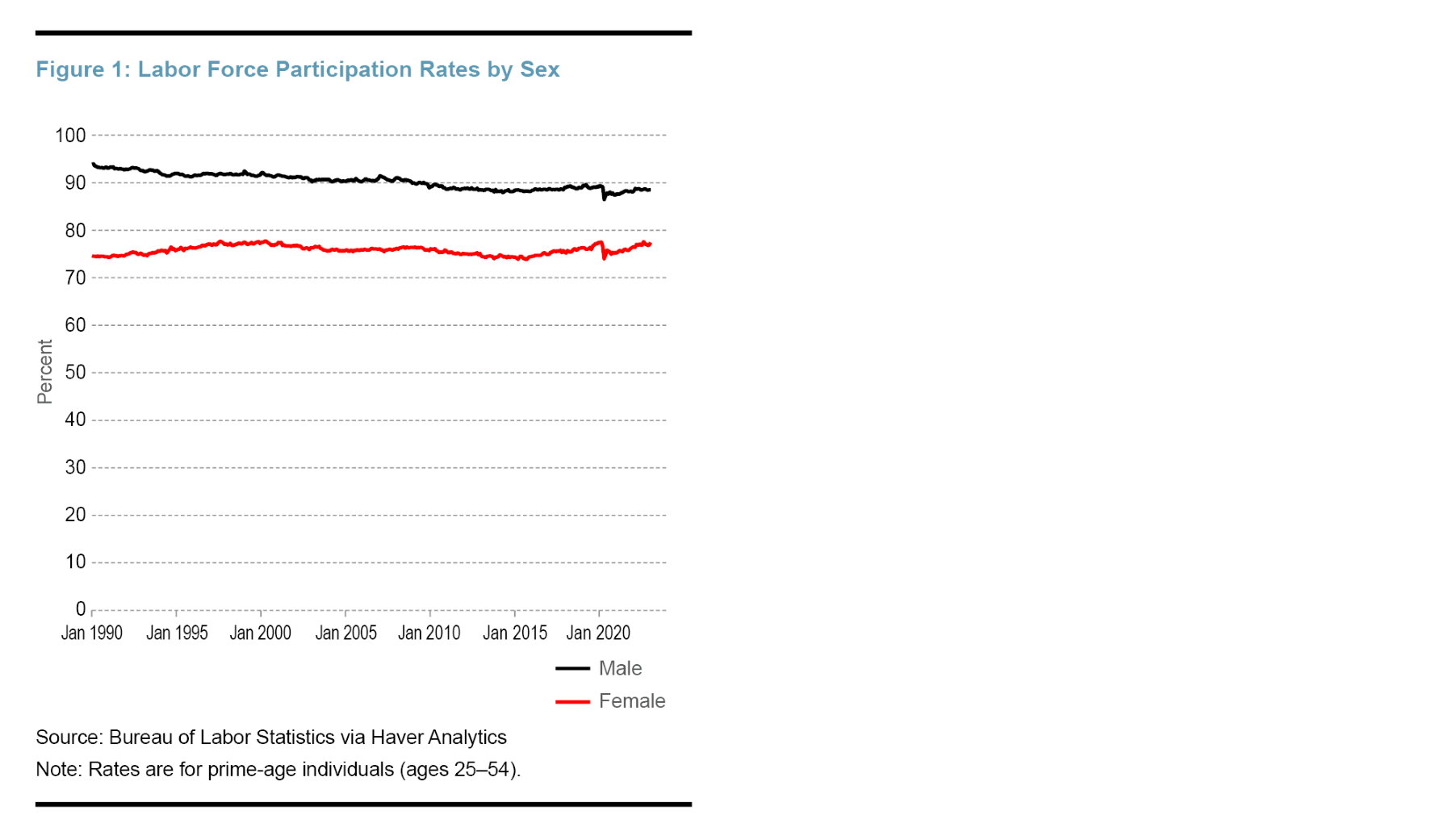 Labor force participation varies by many demographic factors, and a notable and persistent difference exists between men and women. As depicted in Figure 1, the labor force participation rate for prime-age female workers4 was at 74 percent in 1990 and has never breached 78 percent. By comparison, labor force participation by prime-age male workers, while declining slowly over time, has never fallen below 86 percent. There are undoubtedly many reasons why women are not as likely to participate in the labor force as men; this Commentary will focus on three: how the United States taxes the income of married couples, how social security benefits are allocated, and the cost of childcare.