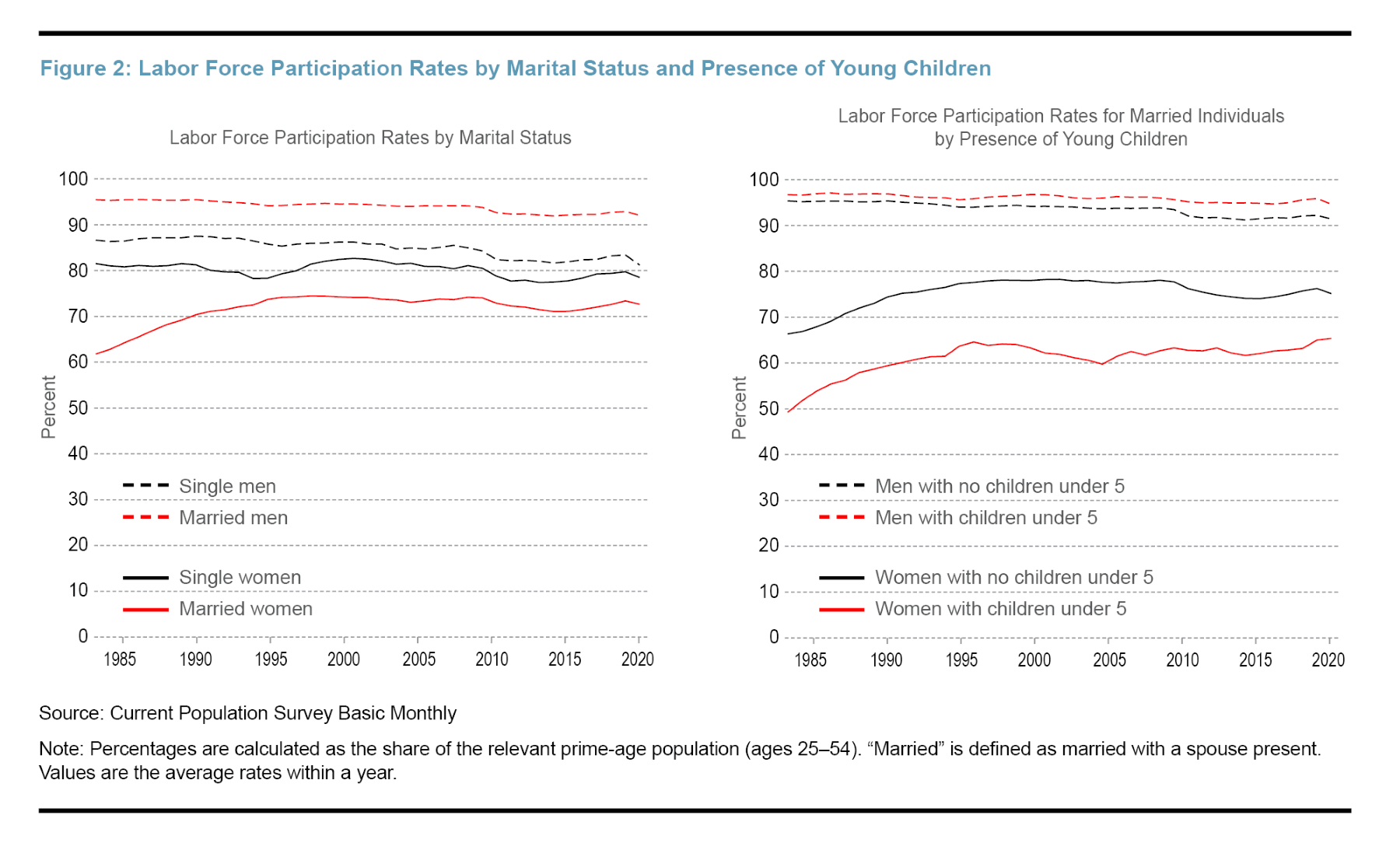 The above factors also affect men’s labor force participation, but the impact of these constraints is felt more by women for the following three reasons. First, married women in opposite-sex couples are less likely to participate in the labor force than either married men or single women.5 The share of married men participating in the labor force is about 7 percentage points higher than that for single men, while the opposite holds true for women. The participation rate for married women is about 7 percentage points lower than that for single women (see the left panel of Figure 2). While single women are less likely to be in the labor force than single men, the difference in labor force participation rates between prime-age married men and prime-age married women is much wider, at over 20 percentage points. Second, married women who do work often earn less than their spouses and are thus so-called “secondary earners.” According to the 2019 American Community Survey, in only about 30 percent of two-worker opposite-sex households does the woman earn more than the man. Last, women are more likely to be the primary caregivers for their young children (Laughlin, 2013). This is demonstrated in the discrepancy between female and male labor force participation rates for couples with young children (see the right panel of Figure 2). Married men with young children are slightly more likely to be in the workforce than married men without young children. For women, the opposite is true. Married women with young children under 5 years old have a participation rate over 10 percentage points lower than married women without young children.