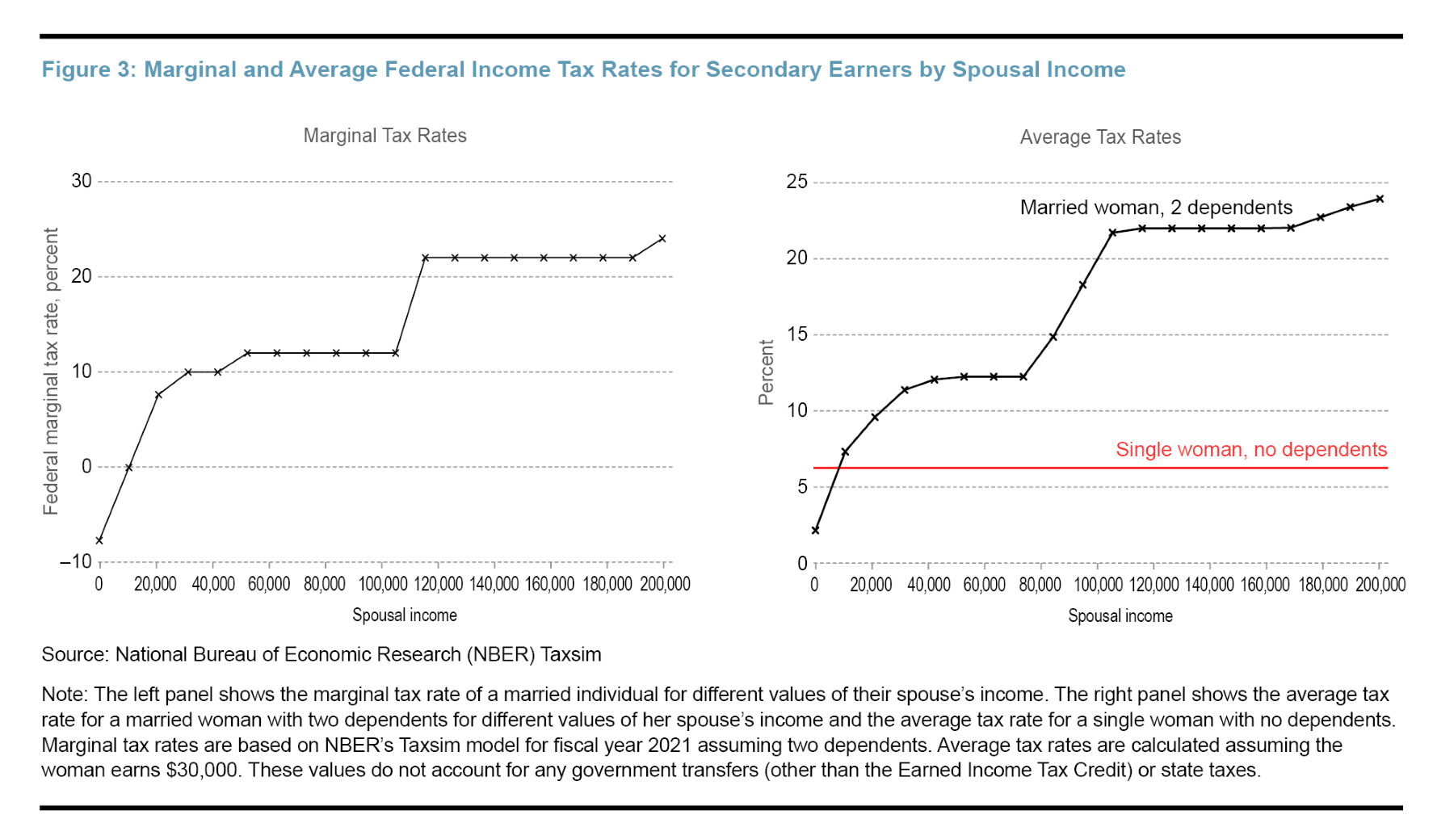 The left panel of Figure 3 plots a sample of federal marginal tax rates for a secondary earner whose spouse earns a given income. This is a simplified example in that it does not account for any additional transfers received, such as housing subsidies or nutrition benefits, and is limited to federal taxes. Since the US tax system is progressive, the marginal tax rate increases as a spouse’s income rises. The graph shows that a person with a spouse who does not work (or earns zero income) will have a negative marginal tax rate (because of the Earned Income Tax Credit, which is a tax credit that is designed to encourage labor force participation). A person with a spouse who earns $40,000 in a year has a marginal tax rate of 10 percent, meaning that the earner will pay 10 cents of his or her first dollar earned paying federal income taxes.