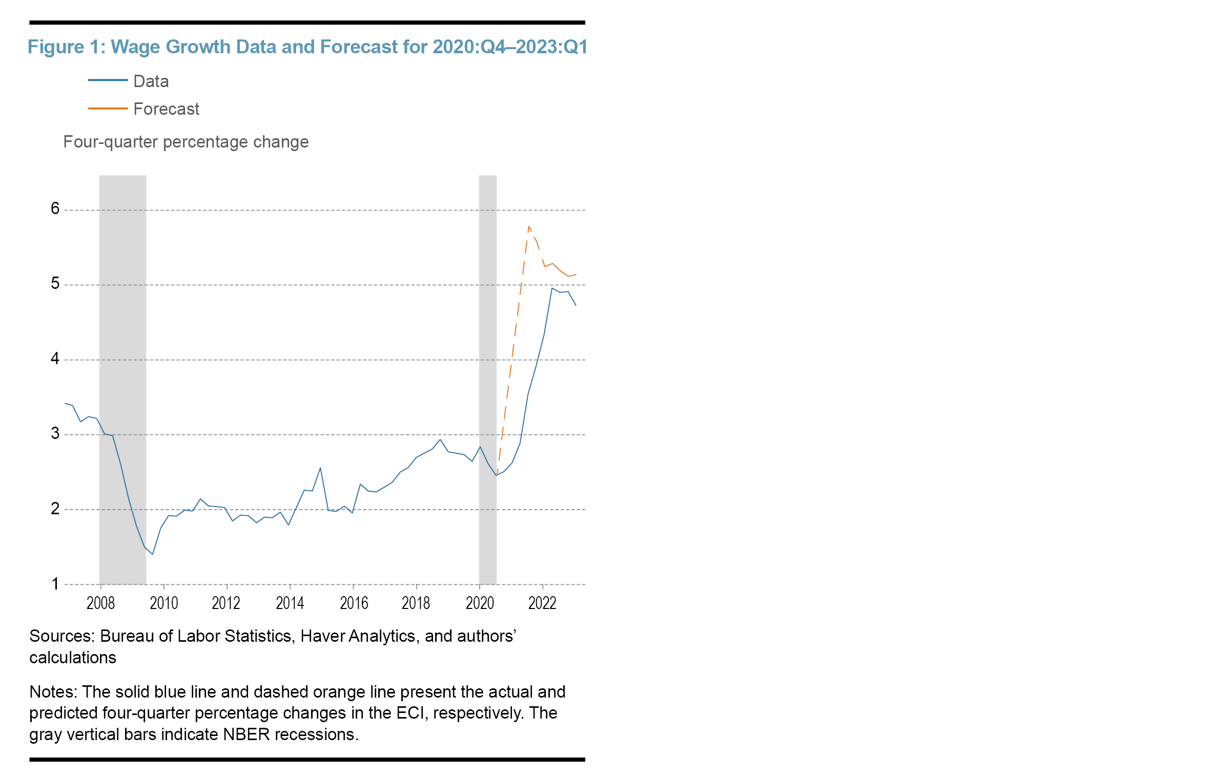 - Our model abstracts from expectations about future inflation or wages. Other research examines the role of expected inflation on wage growth. Glick et al. (2022) find a substantial influence of inflation expectations, and Jordà and Nechio (2022) report that the influence has increased since the pandemic. While this research finds a substantial effect on actual wage growth, Hajdini and others (2023) examine a 2022 survey of consumers and report a relatively modest effect of expected inflation on expected wage growth. Return to 3