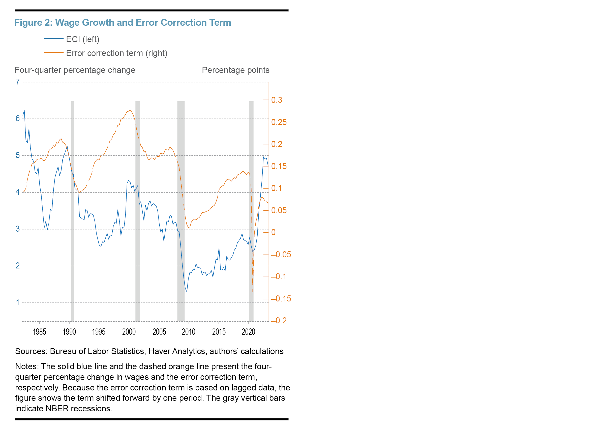- The average of the error correction term was 0.056 in the period 2020:Q4–2023:Q1, below the average of 0.082 for the period 2010:Q1–2019:Q4. As the figure shows, the contribution of the error correction term to the average level of wage growth during economic expansions has declined in each of the expansions since the 2001 recession. Return to 12