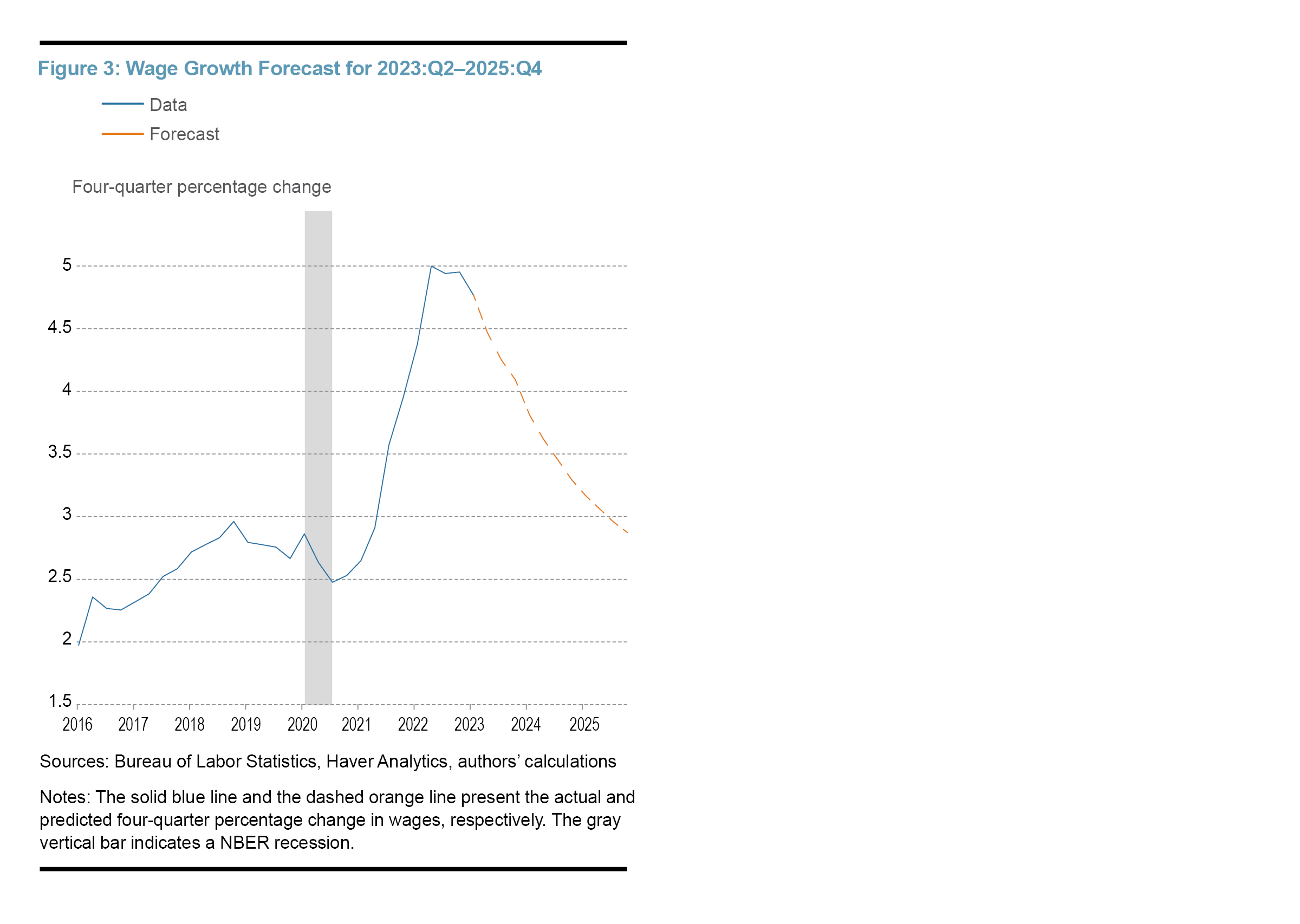 While wage growth remains higher than before the pandemic, inflation has come down from its recent peak, and wage pressure as measured by the model’s estimated deviation of the long-run labor market equilibrium has already begun to ease. Both these developments point to declines in future wage growth. Indeed, the estimated model’s forecast of wage growth declines gradually to about 3 percent annually by 2025.