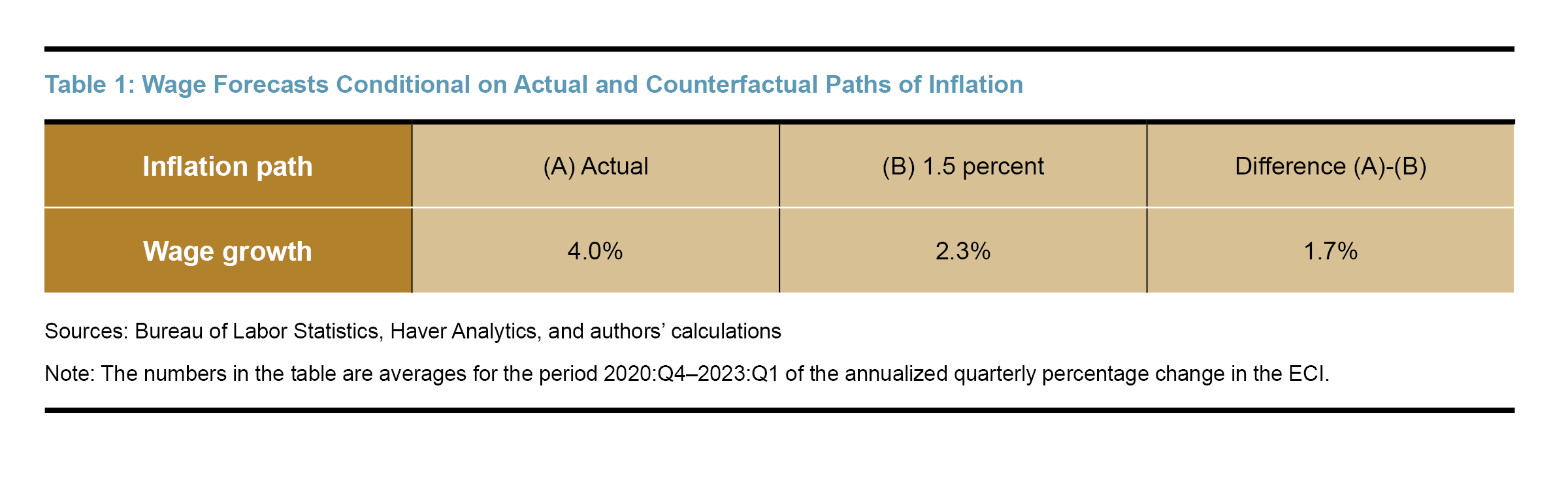 We isolate the pass-through from inflation from late 2020 through early 2023 by conducting a counterfactual exercise. Specifically, we use the estimated wage Phillips curve to generate two conditional forecasts of wage growth that assume different paths for inflation. The first conditional forecast is based on the time series data of the price level, real consumption, and hours through 2023:Q1. The second one is a counterfactual forecast conditional on a price level that increases from 2020:Q4 onward at a constant rate of 1.5 percent annually, the average inflation rate during the economic expansion from 2010:Q1 to 2019:Q4.