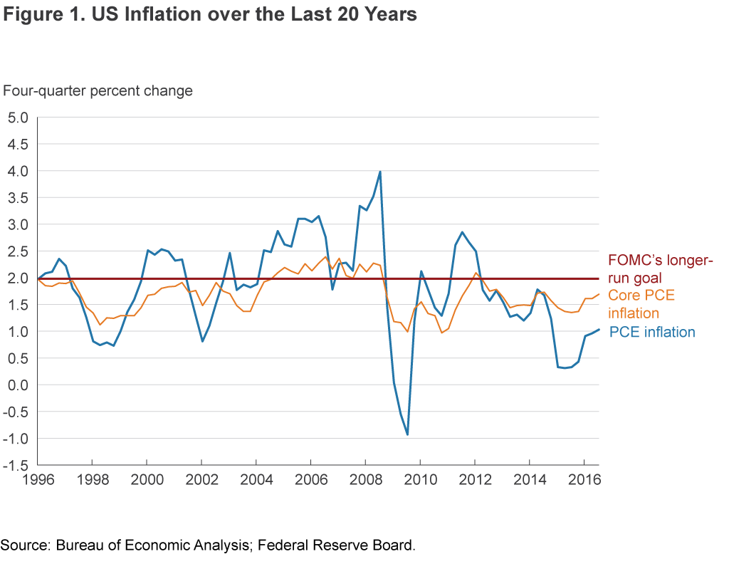 Inflation as measured by the PCE has averaged 1.4 percent on a trailing four-quarter basis since the recovery began in 2009:Q3—0.6 percentage points below the Federal Open Market Committee’s (FOMC) long-run objective of 2 percent. By comparison, over the 10-year period preceding the financial crisis, PCE inflation averaged 2.0 percent (see figure 1). Meanwhile, inflation excluding food and energy (core PCE) averaged 1.5 percent and 1.8 percent over the same periods, respectively.