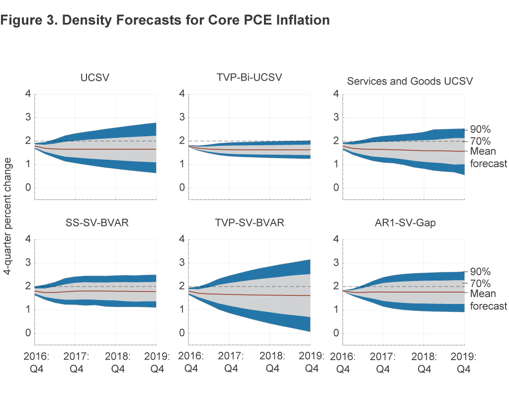 Each of these six models is estimated using data through 2016:Q3 and then simulated to obtain thousands of forecast paths up to 13 quarters out in order to match the SEP projection horizon (i.e., from 2016:Q4 to 2019:Q4).11 The mean of these thousands of forecast paths is denoted as the point forecast; it reflects the most likely forecast of future inflation generated by a given model.12
