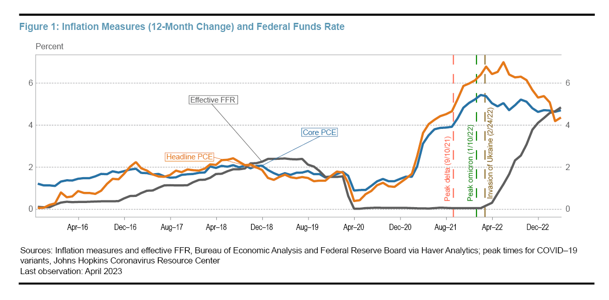 In June 2021, inflation in the United States started to rise, with headline PCE at 4.0 percent and core PCE at 3.6 percent year over year (Figure 1). In the June 2021 FOMC meeting, the committee decided not to raise the policy rate. In addition, the Summary of Economic Projections (SEP) released after the meeting shows the median projection of the appropriate policy rate staying at zero through the end of 2021. Chair Jerome Powell explained on several occasions that high inflation was temporary and largely a result of supply chain issues and thus did not yet warrant an adjustment in the FFR.1 Although inflation did not slow as expected, and, in fact, rose instead, the FOMC did not increase the policy rate from zero until its March 2022 meeting, at which time headline PCE inflation had risen to more than 6 percent.