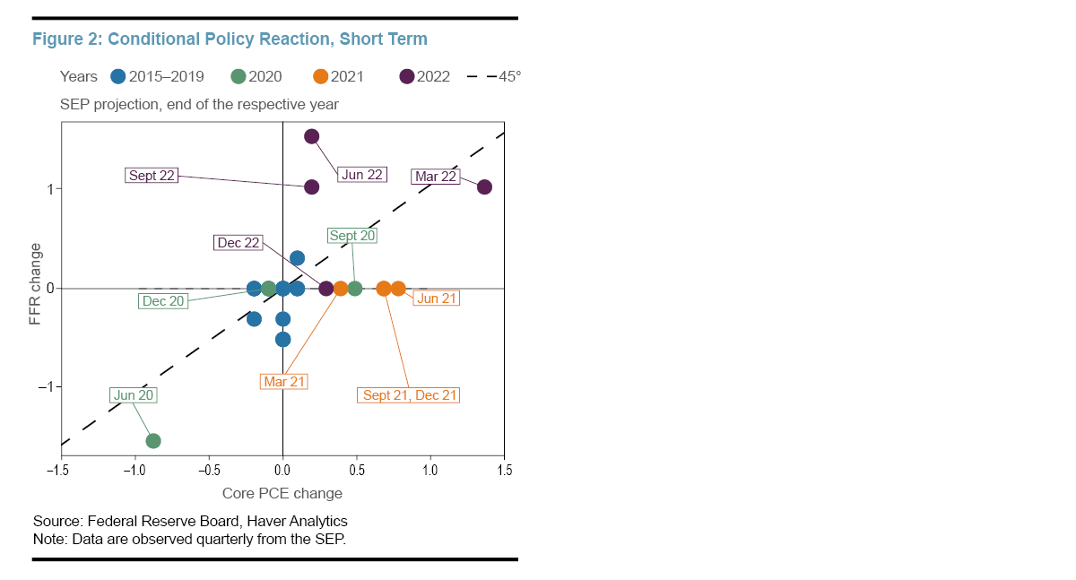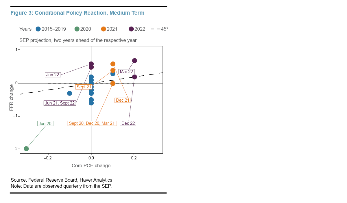 Figure 2 shows two phases of policy intentions. The first one is the low-for-long period from the beginning of the COVID economic crisis to the end of 2021, a period of policy underreaction (at least in the short run) relative to the canonical model guidepost described above. Specifically, except for the June 2020 SEP,7 all data points are on the horizontal axis. Points on the horizontal axis reflect the cases in which the median expectation of core PCE inflation rises or falls while at the same time the median expectation of the FFR remains unchanged.8 During this period, policymakers expected to hold the federal funds rate at its ELB while inflation was expected to increase.