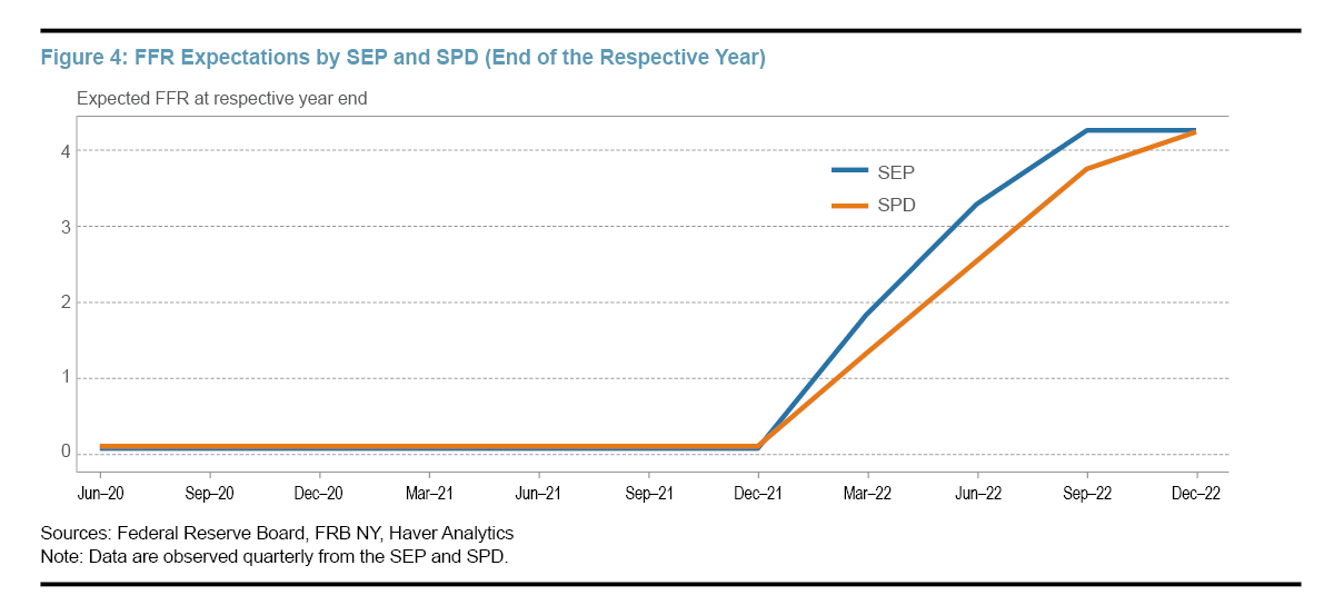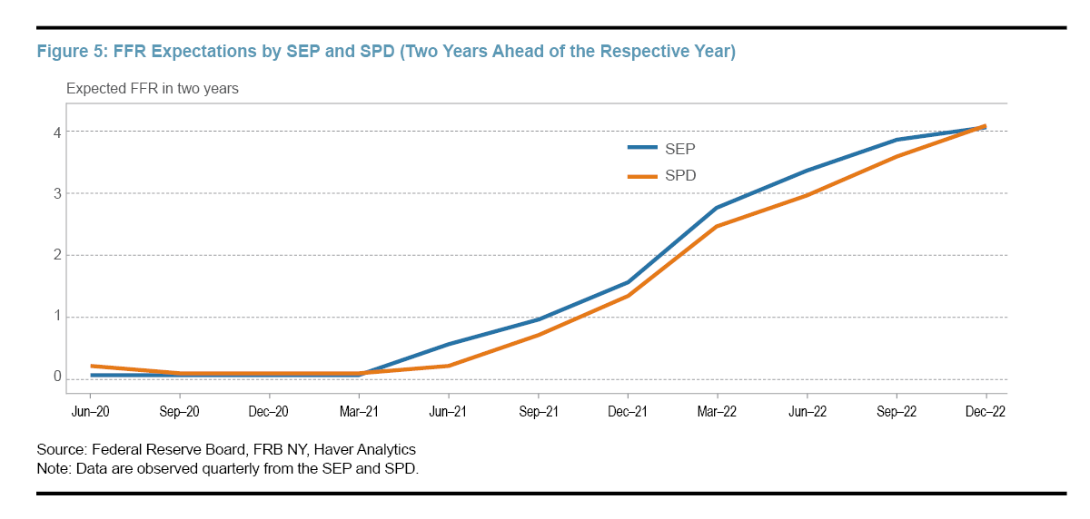 Thus, data from the SPD and SEP show that, in 2021, although the FOMC did not tighten policy immediately after it expected inflation to rise, the committee on the whole thought it would be appropriate over the medium term to gradually increase the policy rate to keep pace with inflation, and this intention was largely understood by the private sector.