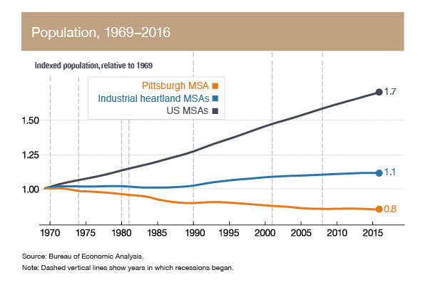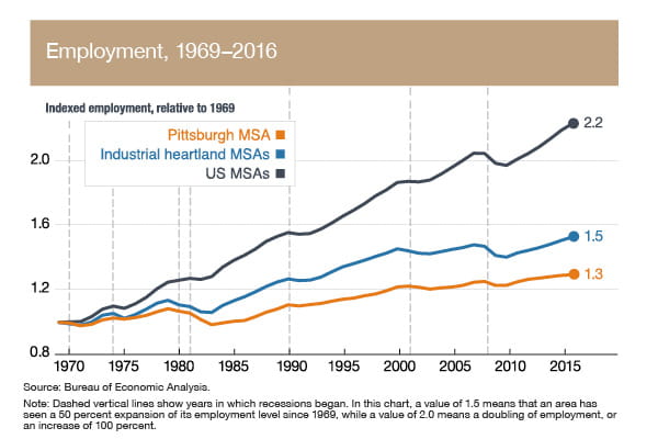 Pittsburgh’s economy has changed considerably following the significant structural adjustments to the steel industry, and to manufacturing more generally, that occurred roughly 40 years ago. This report evaluates the performance of Pittsburgh’s economy since these events along a number of dimensions, including employment, unemployment, population, and per capita income. It also explores the emergence of new industries in the area and discusses the region’s prospects for future growth. Throughout this report, we compare the economic performance of the Pittsburgh metropolitan statistical area not only to that of the United States as a whole, but also to that of a subset of historically manufacturing-intensive metropolitan areas that collectively this report terms “the industrial heartland.”