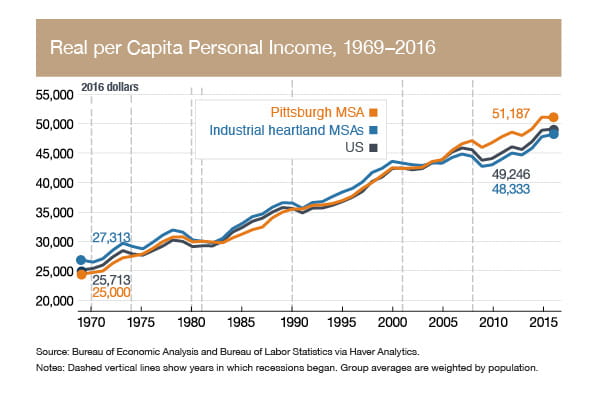 - Pittsburgh’s per capita income fell below the nation’s average during the 1980s, but it rebounded by the beginning of the 1990s and was approximately 4 percent higher than the national average by 2016.