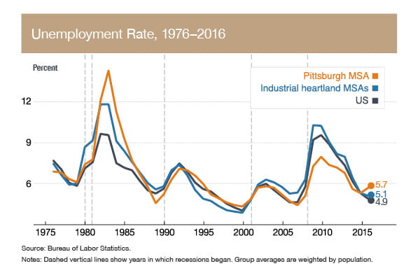 - While the Pittsburgh MSA suffered greatly during and after the twin recessions of the early 1980s, its experience during and after the Great Recession was altogether different, with far-less-severe job losses in percentage terms than the nation’s and a more rapid return to prerecession employment levels.